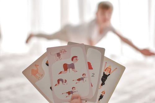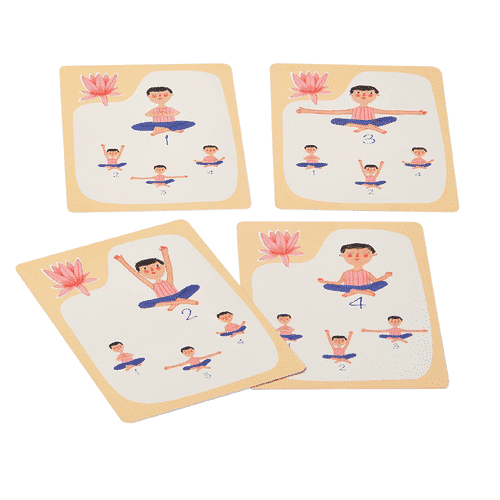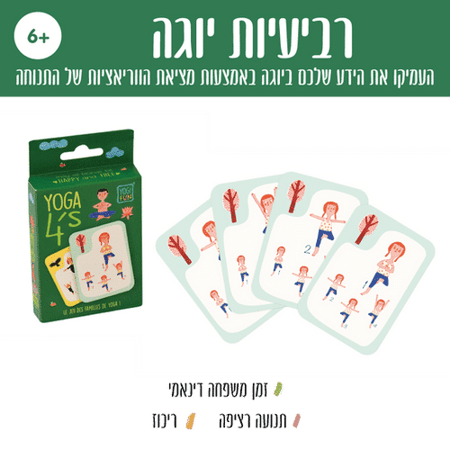 משחק רביעיות יוגה לילדים המאפשר לילדים ללמוד ארבע ווריאציות שונות של כל תנוחה.