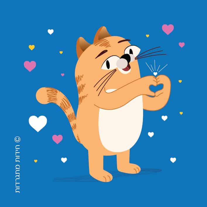 בצד האחורי של הכרטיס יש איור של החתול של "חידות מתגרדות" בסיטואציות שונות שהמשותף לכולן הוא מסר לא מילולי של חיבה, שמחה וכיף: שולח נשיקה, מחזיק בלונים, אוכל כריך ענקי, מחזיק זר פרחים, פורש קשת ועוד ועוד.